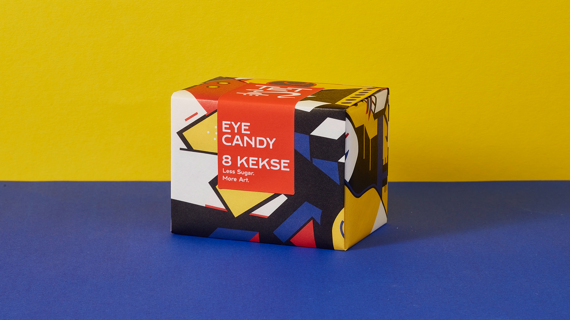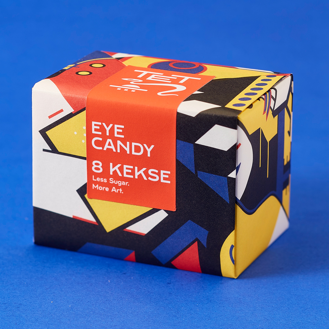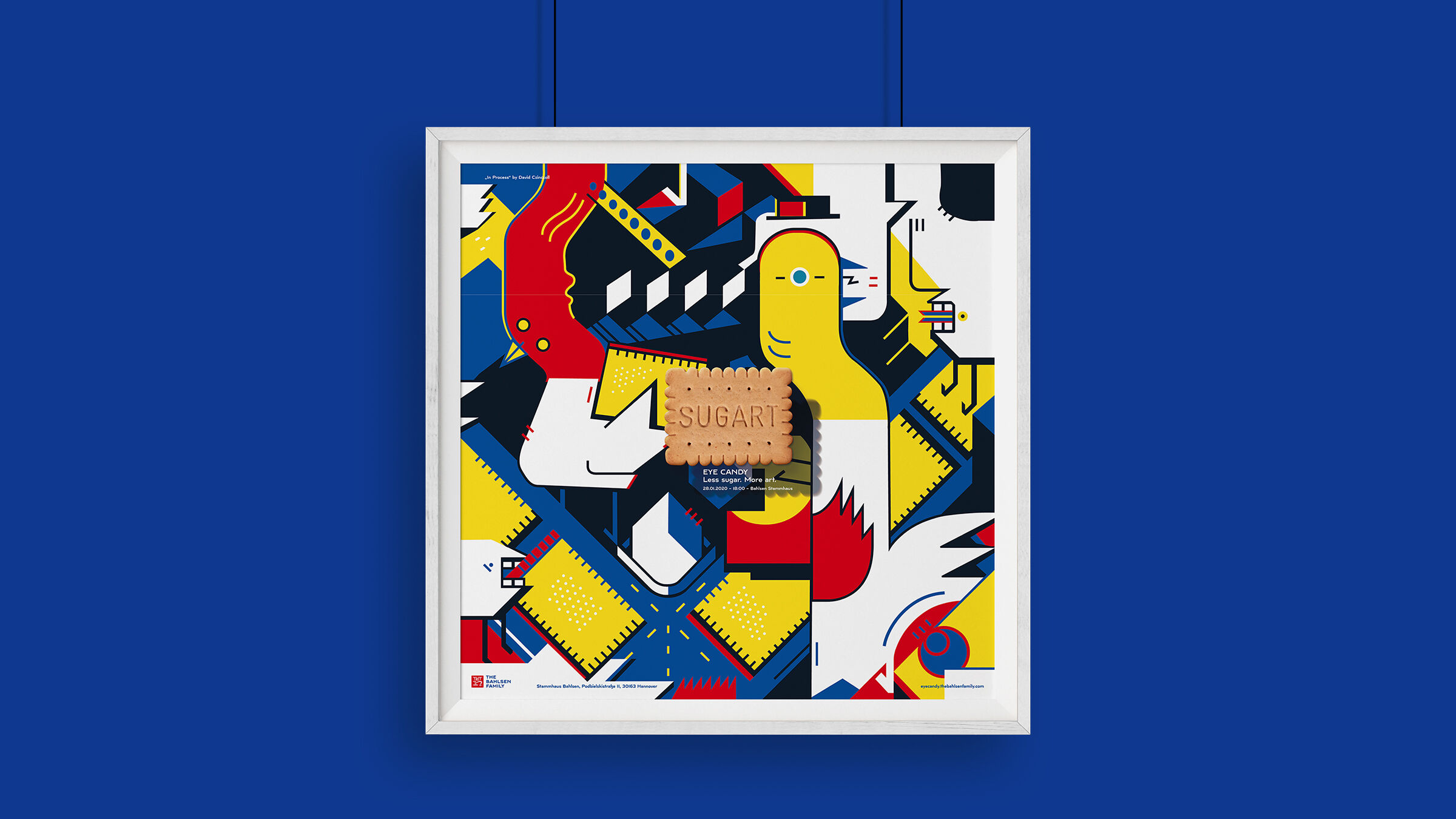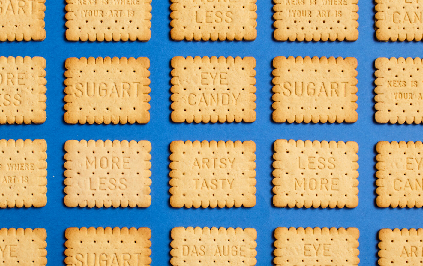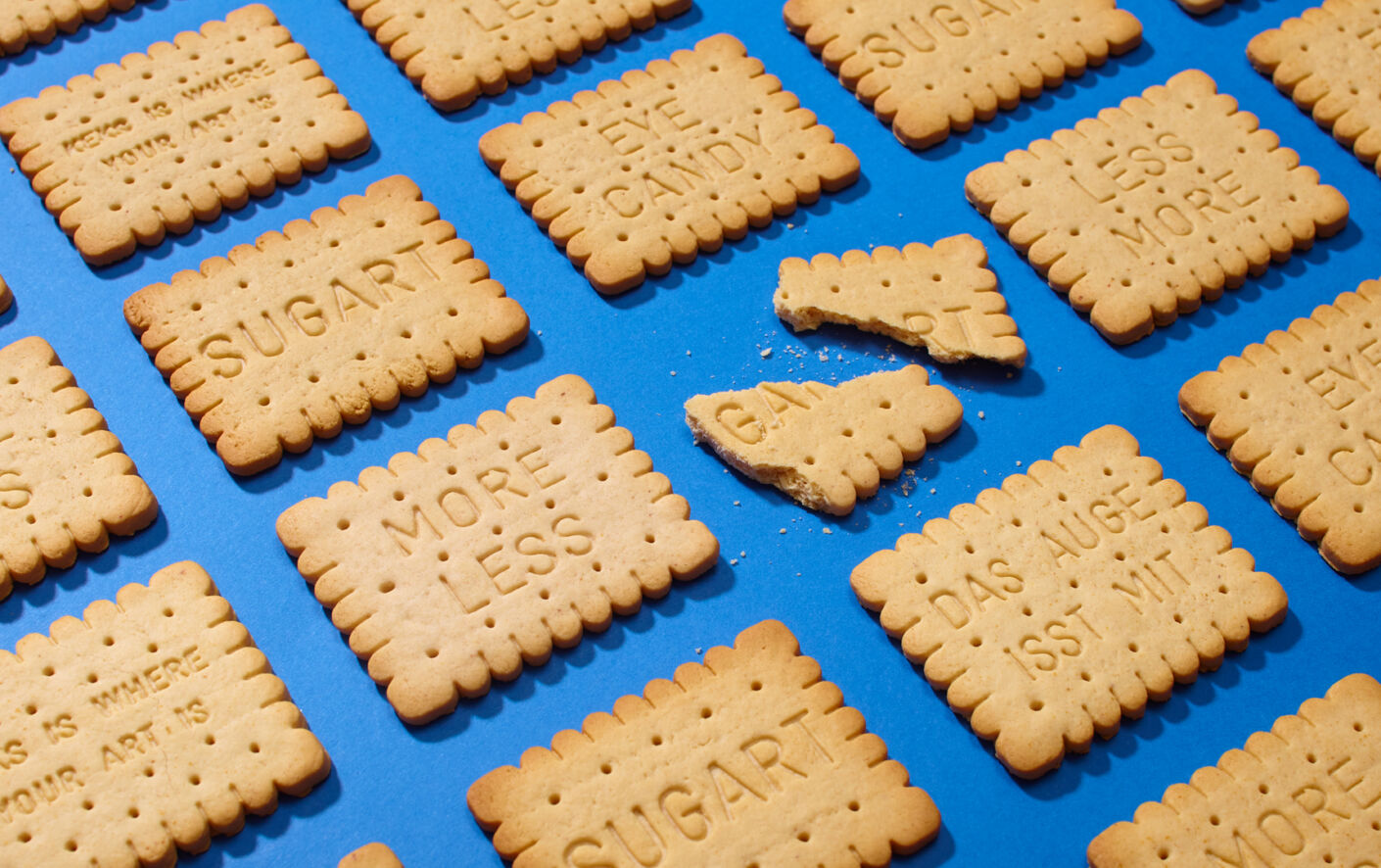 Zucker für die Augen. Die Verpackung kann als Poster wiederverwendet werden und jeden Keks ziert eine Botschaft, die eine Brücke zwischen Zucker und Kunst schlägt.
