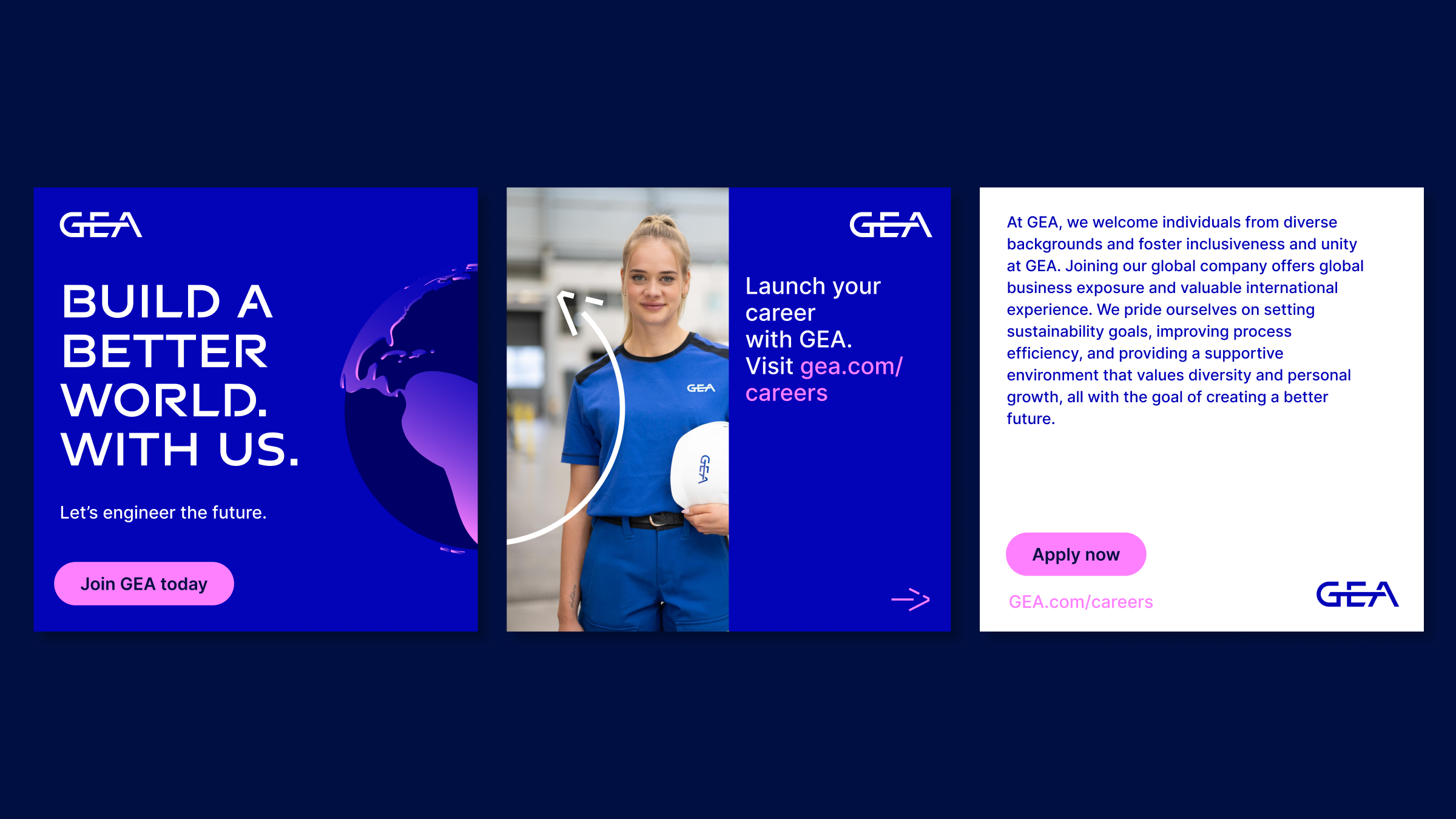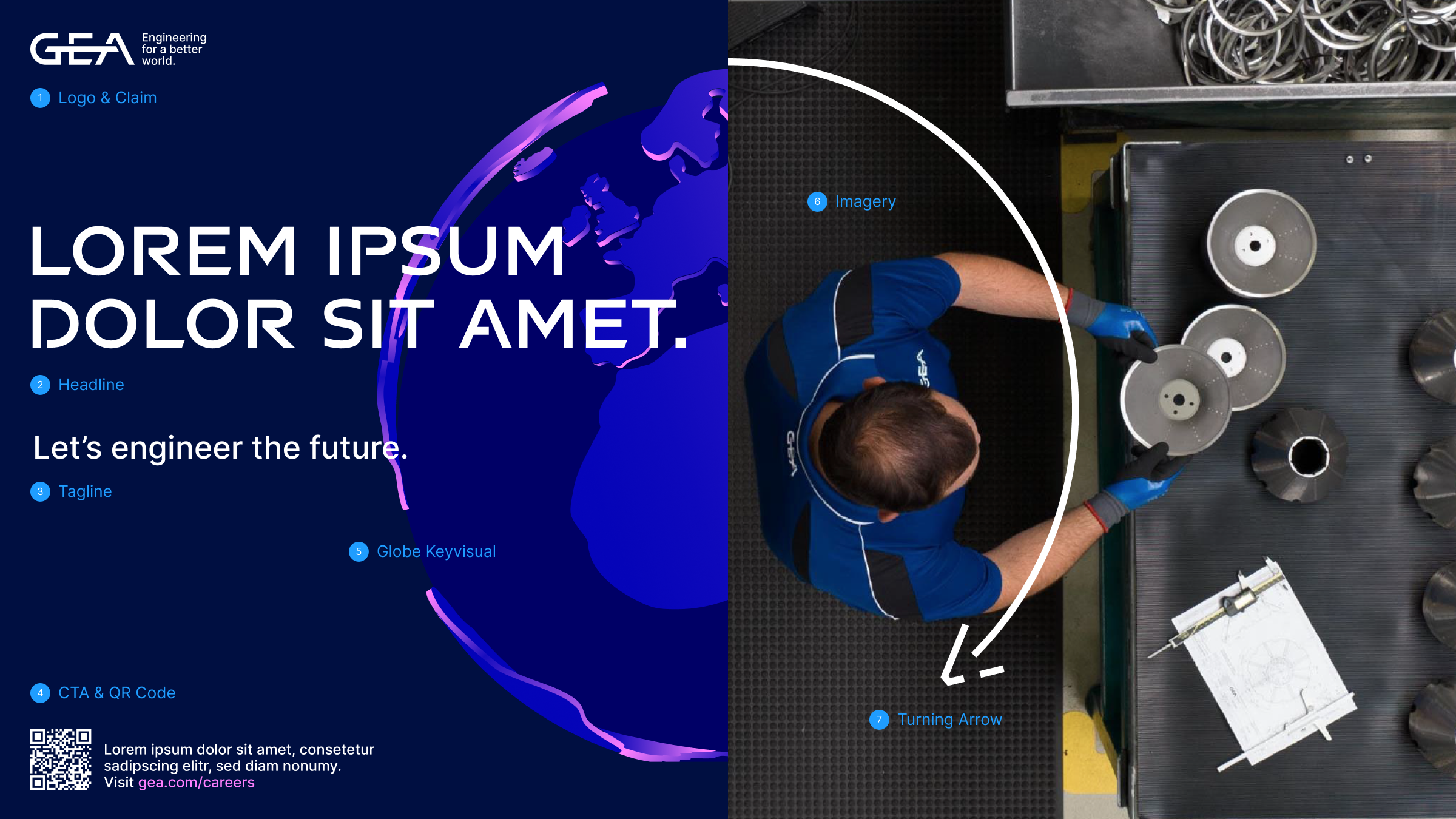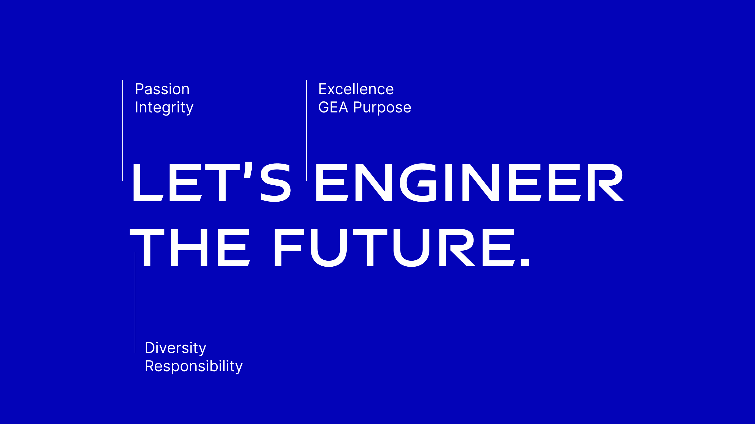 Die EVP-Tagline „Let’s engineer the future“ wurde sorgfältig ausgearbeitet, um die Kernwerte von GEA zu verdeutlichen. Durch eine durchdachte Synthese von Positionierung und Image wollten wir ein kollektives Gefühl der Zielorientierung und des Aktivismus bei bestehenden und potenziellen Mitarbeitern wecken. Die Tagline spiegelt nicht nur das Engagement von GEA für technische Spitzenleistungen wider, sondern ist auch ein Appell für Innovation und Fortschritt.
