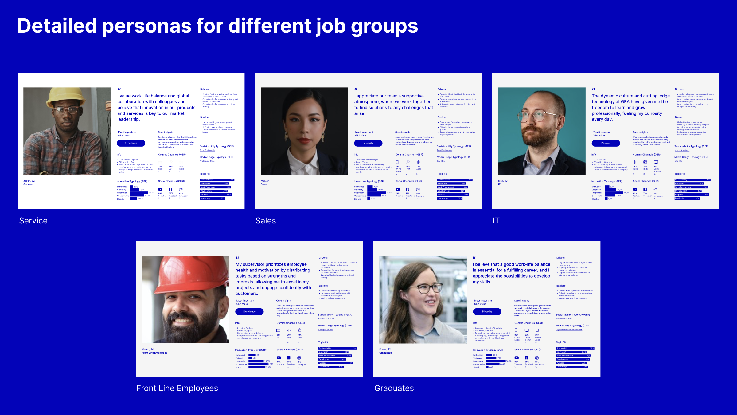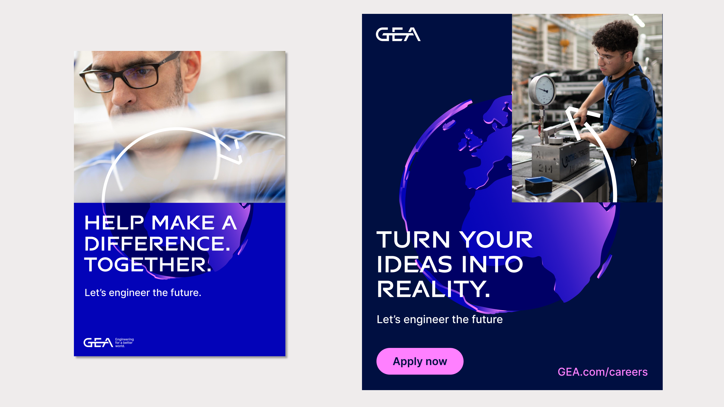 Unsere Strategie beinhaltete eine detaillierte Analyse umfangreicher Mitarbeiterbefragungen, die international für verschiedene Berufsgruppen durchgeführt wurden. Indem wir die Werte von GEA mit den Erwartungen der Mitarbeiter in Einklang brachten, konnten wir eine überzeugende EVP-Tagline und eine Headline-Mechanik entwickeln, die gut zur Marke passten, aber auch einen einzigartigen thematischen Fokus für jedes Zielgruppen-Cluster boten.