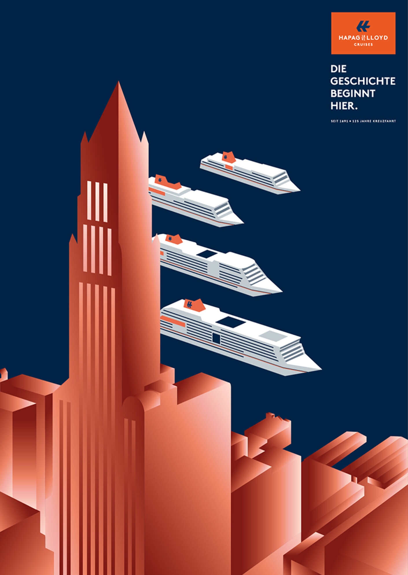 Der neue Look basiert auf einem modernen Farbeinsatz und der neuen Hausschrift „Brown“, die eine Verbindung zwischen der Blütezeit der Kreuzfahrt und der hochtechnologischen Qualität der illustrativen Werbegrafik herstellt.