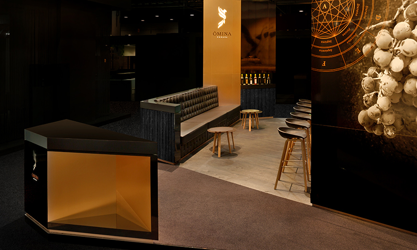 Der Messeauftritt basiert auf einem modularen System, dem ebenfalls die Dreiecksform zugrunde liegt. Das Zusammenspiel der besonderen Materialien schafft eine warme, mystische Atmosphäre.