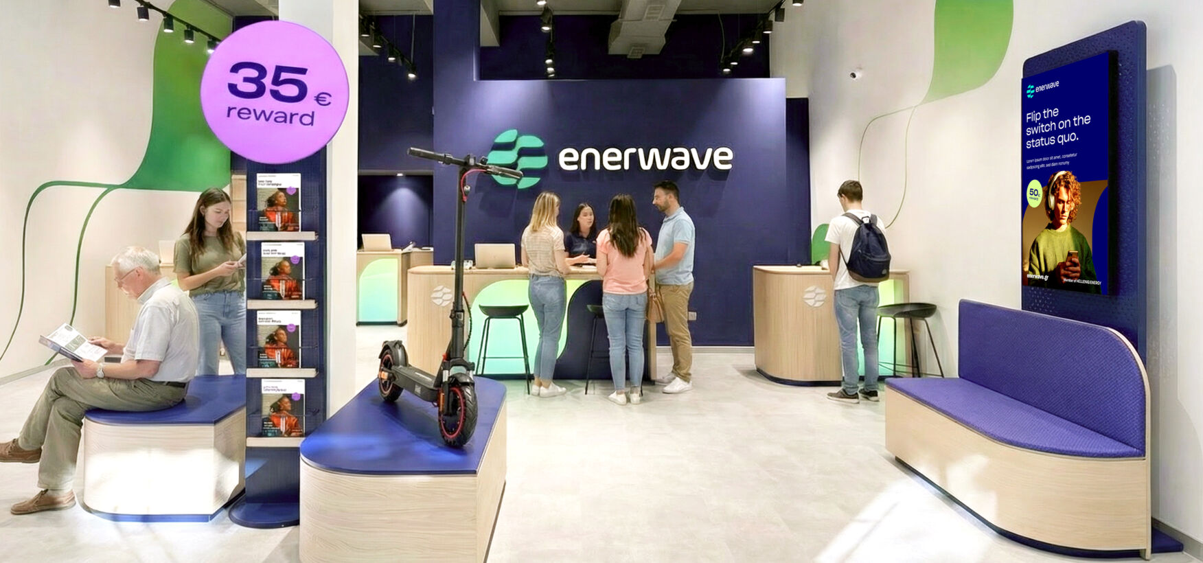 Elpedison became Enerwave. With a new design system inspired by movement, clarity, and connection, it forms the heart of an identity that consistently tells one story – from logo to store to communication: We are dynamic, people-centered, and focused on real energy solutions.